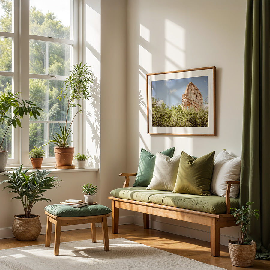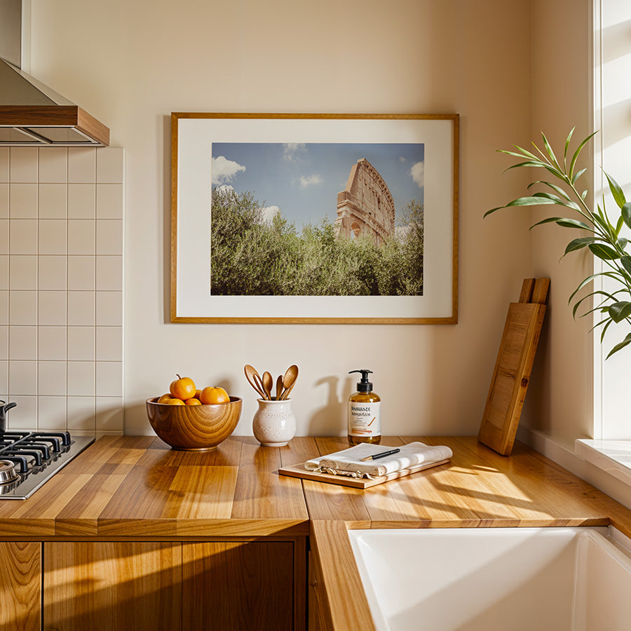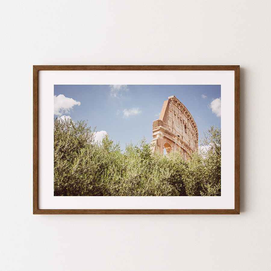 This Rome wall art captures the quiet strength of ancient beauty. The Colosseum rises above dense olive trees and soft Roman light, evoking stillness, memory, and timeless charm.