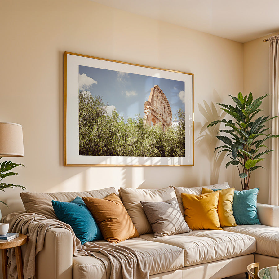 This Rome wall art invites you to pause beneath the Roman sun. Framed by olive trees and open sky, the Colosseum stands with calm resilience. A landmark not just of history, but of quiet presence. There’s a softness here that brings both grandeur and grounding into your space.