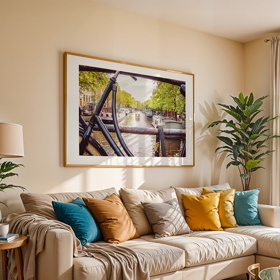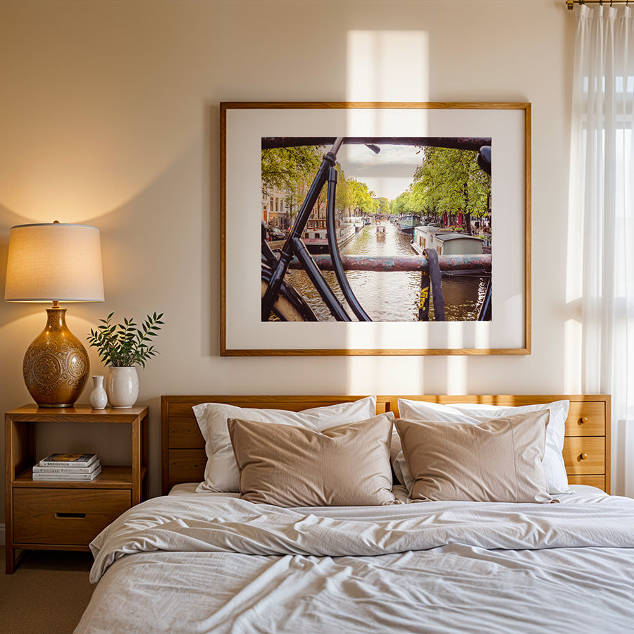 This Amsterdam wall art captures the easy rhythm of Prinsengracht on a summer day, framed through a classic bicycle with boats drifting along the canal. A piece that brings the city’s warm, laid-back energy into your space.