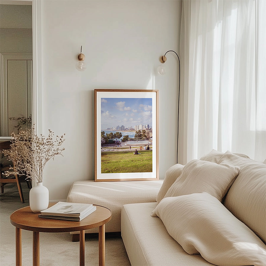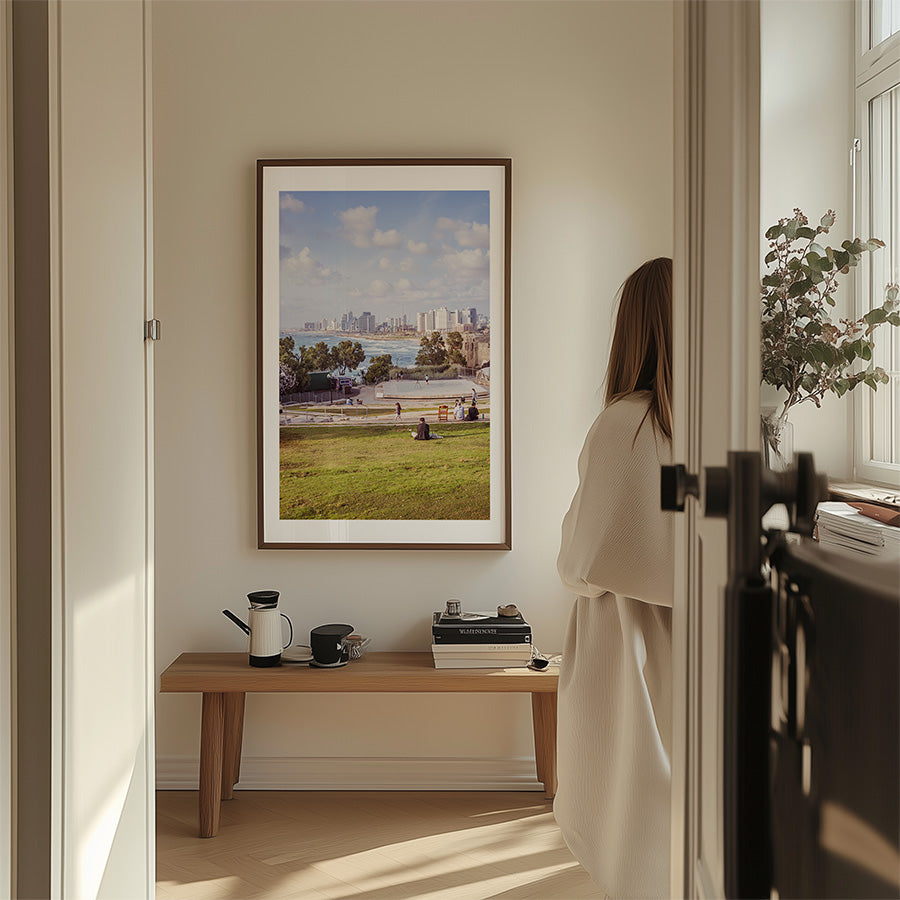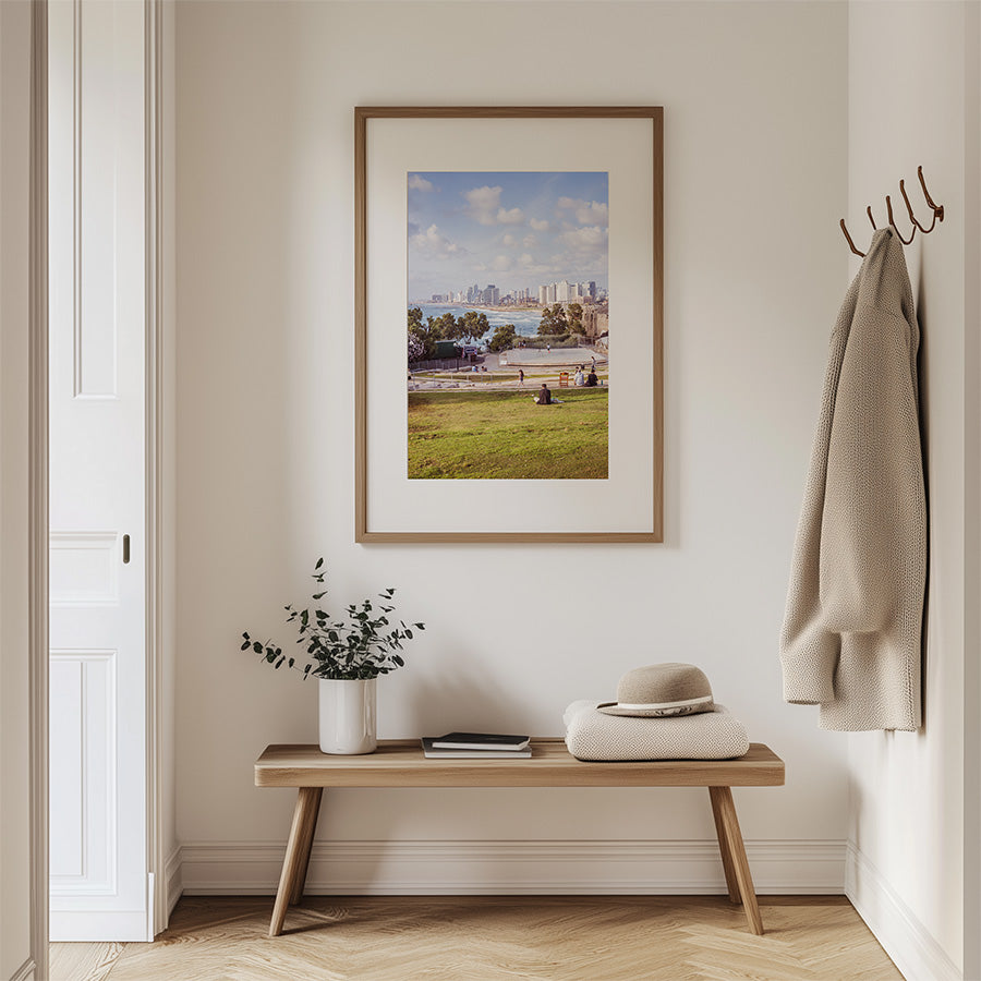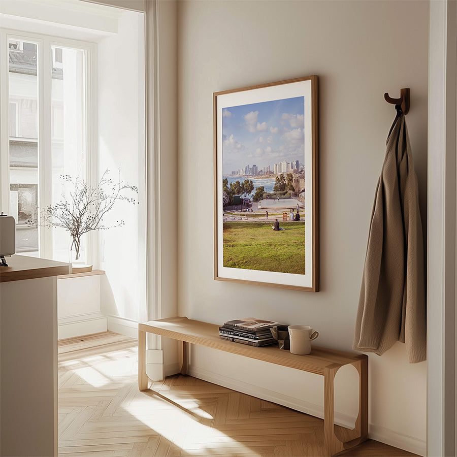 This Yafo amphitheatre wall art captures a peaceful coastal moment at Abrasha Park, where the calm sea meets the vibrant pulse of Tel Aviv’s cityscape. A refined view of urban nature and rich history side by side.